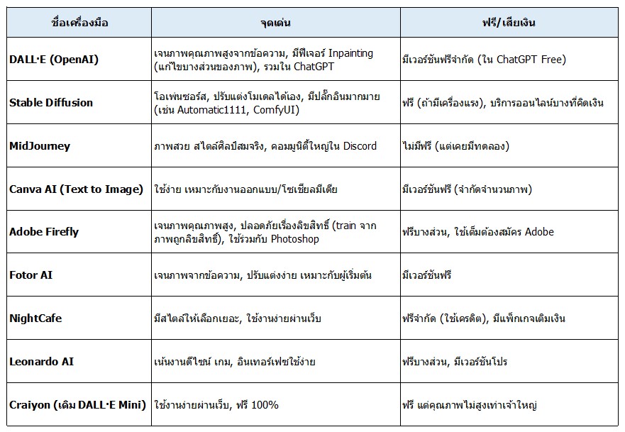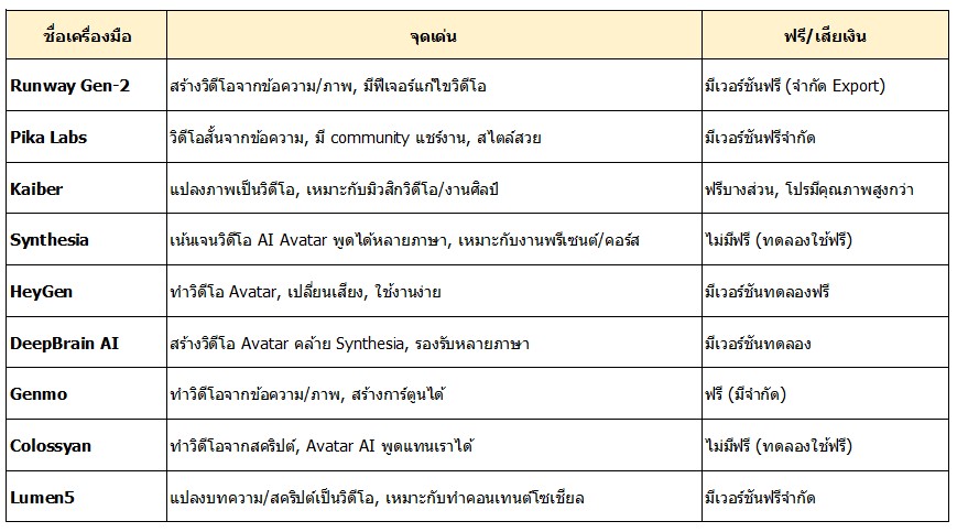 บทความนี้จะพาไปรู้จักกับเครื่องมือ AI เด่น ๆ ที่ช่วยสร้างรูปภาพและวิดีโอ พร้อมจุดเด่นและความเหมาะสมของแต่ละตัว 🖌️