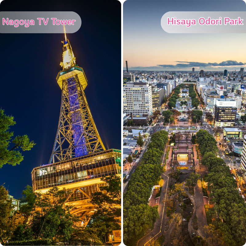 หนึ่งในจุดชมวิวเมืองสุดโรแมนติกคือ Nagoya TV Tower หอคอยแห่งแรกของญี่ปุ่นที่สร้างขึ้นในปี 1954 คุณสามารถขึ้นไปบนดาดฟ้าสำหรับชมวิว 360 องศาของเมืองนาโกย่า โดยเฉพาะยามค่ำคืนที่แสงไฟส่องประกาย 🌃 รอบๆ หอคอยยังมี สวนฮิซายะโอโดริ ที่เหมาะสำหรับการเดินเล่นท่ามกลางบรรยากาศสีเขียว