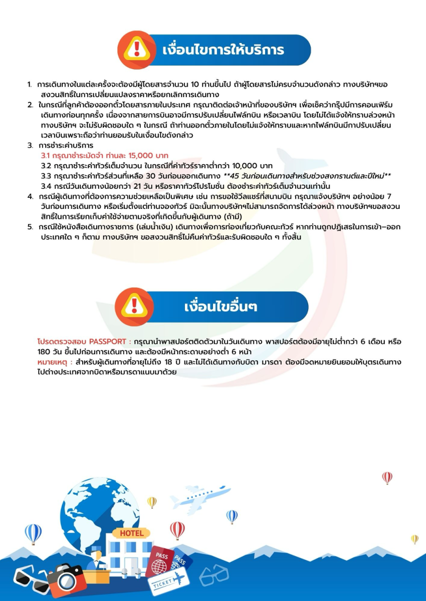 หมายเหตุ สำหรับท่านที่ไม่ได้เข้าร่วมโปรแกรมเสริมบริษัทจะพาท่านเข้าที่พักล่วงหน้าและเพื่อให้การเดินทางของท่านเป็นไปอย่างราบรื่น ปลอดภัย และเป็นไปตามมาตรฐานของทัวร์ ทางบริษัทฯ ขอความร่วมมือให้ท่านสำรองโปรแกรมเสริมผ่านหัวหน้าทัวร์หรือมัคคุเทศก์ท้องถิ่นที่ได้รับมอบหมายเท่านั้น ทั้งนี้เพื่อประโยชน์สูงสุดในด้านราคา ความปลอดภัย และการบริหารจัดการเวลาของคณะทัวร์โดยรวม
