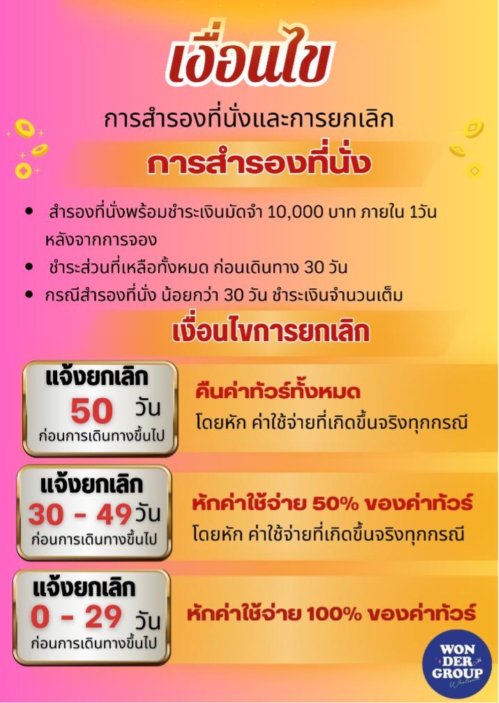 15 ธ.ค. 68 - 19 ธ.ค. 68 | 20,999 บาท | 4,500 บาท | สอบถามเพิ่มเติม | จอง |