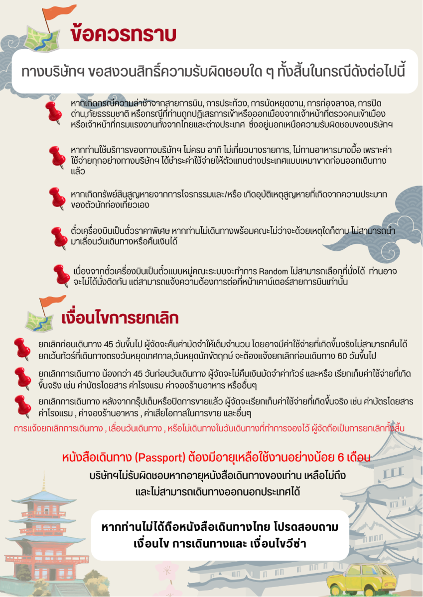 **ใช้เวลาเดินทางโดยประมาณ 6 ชั่วโมง เวลาท้องถิ่นประเทศญี่ปุ่นเร็วกว่าประเทศไทย 2 ชั่วโมง กรุณาปรับเปลี่ยนนาฬิกาของท่าน เพื่อความสะดวกต่อการนัดหมาย**