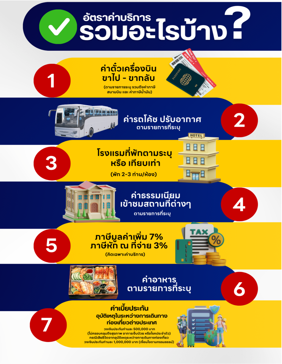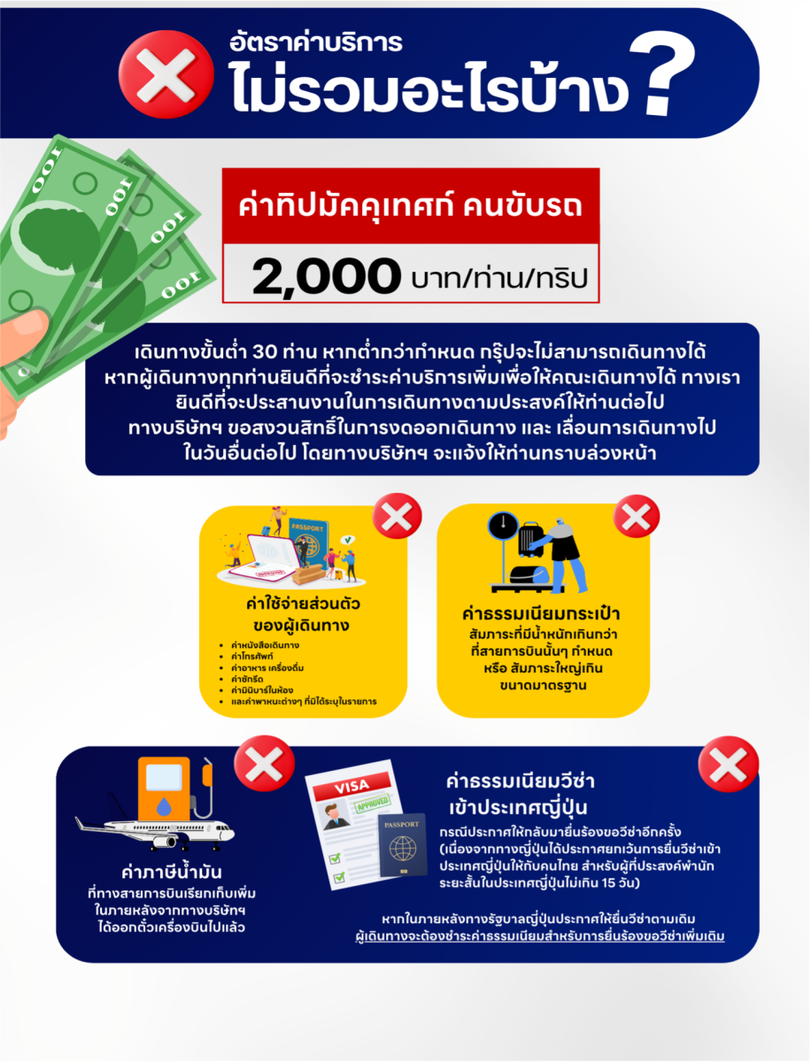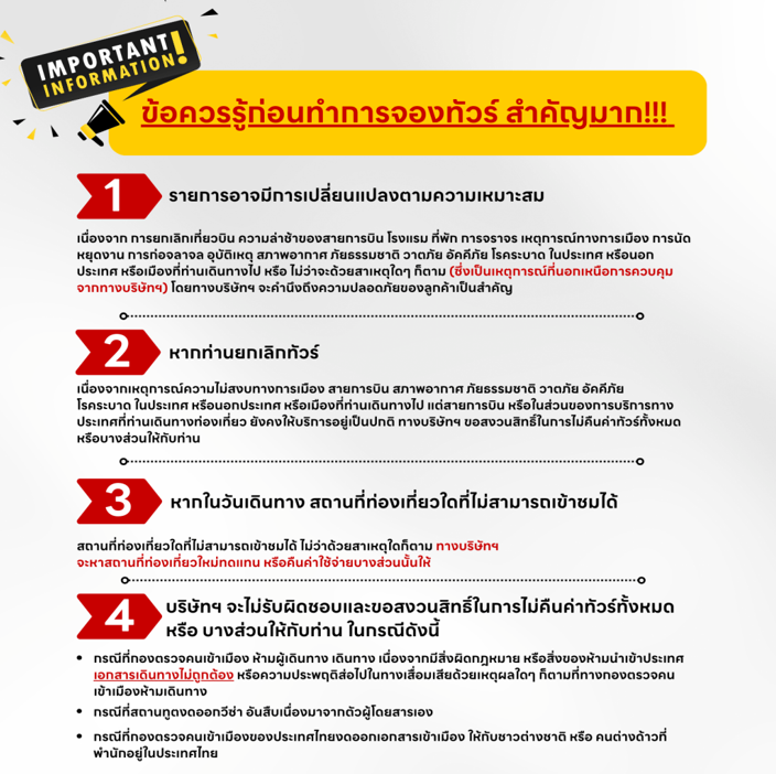 ** เพื่อความถูกต้อง กรุณาตรวจสอบข้อมูลเดินทางและเงื่อนไขการชำระเงินกับทางเจ้าหน้าที่ฝ่ายขายทุกครั้ง