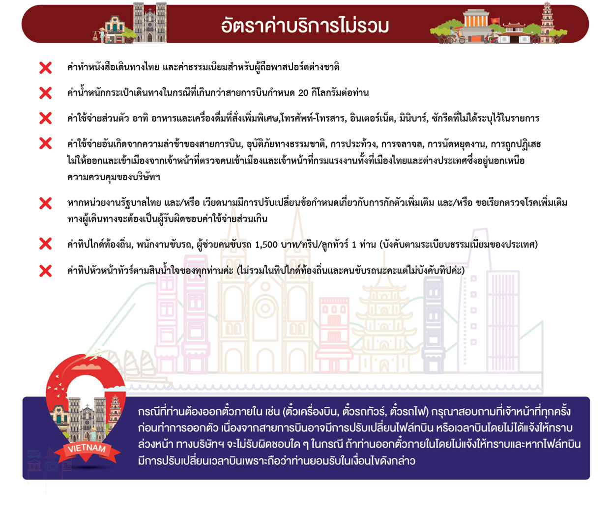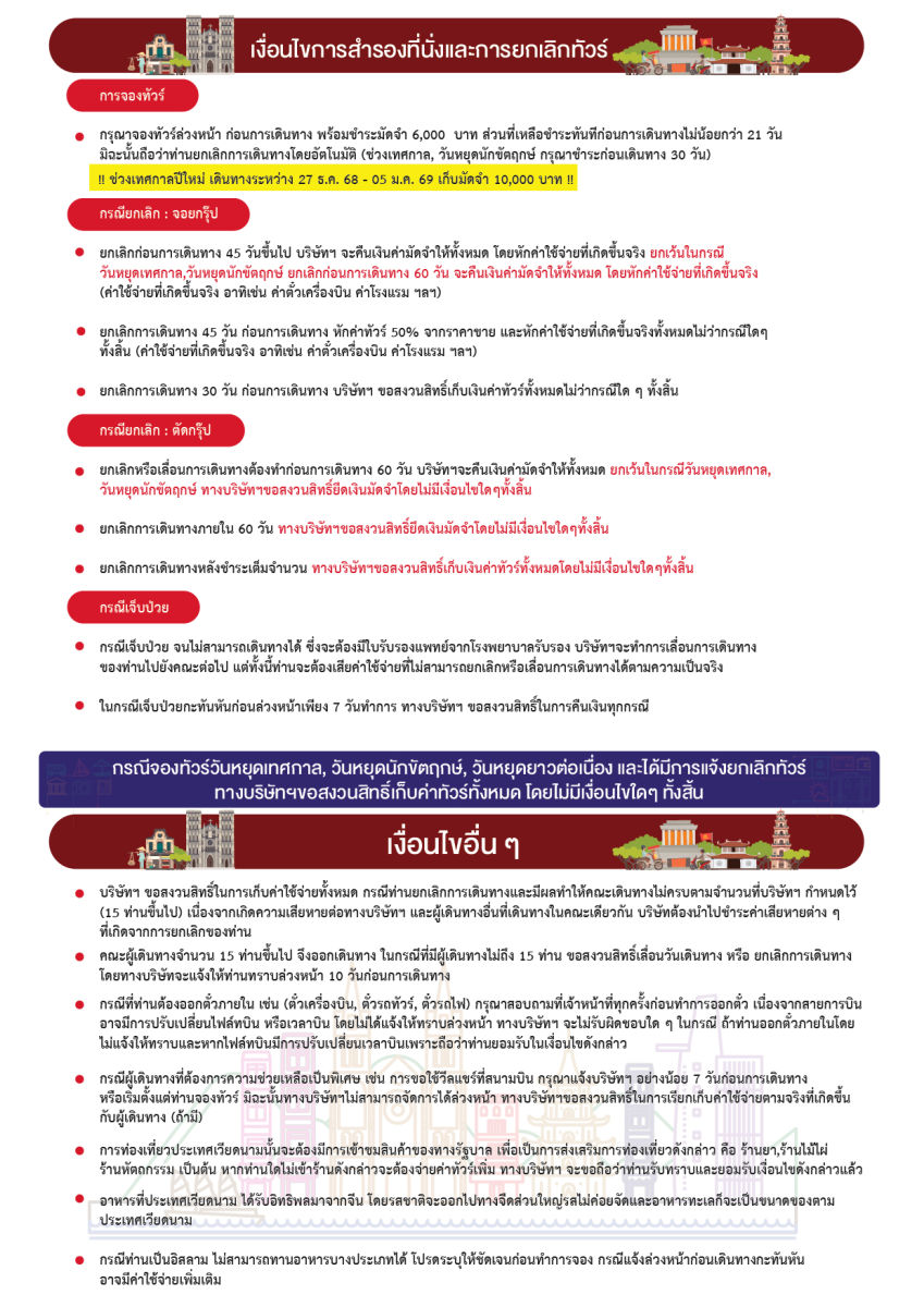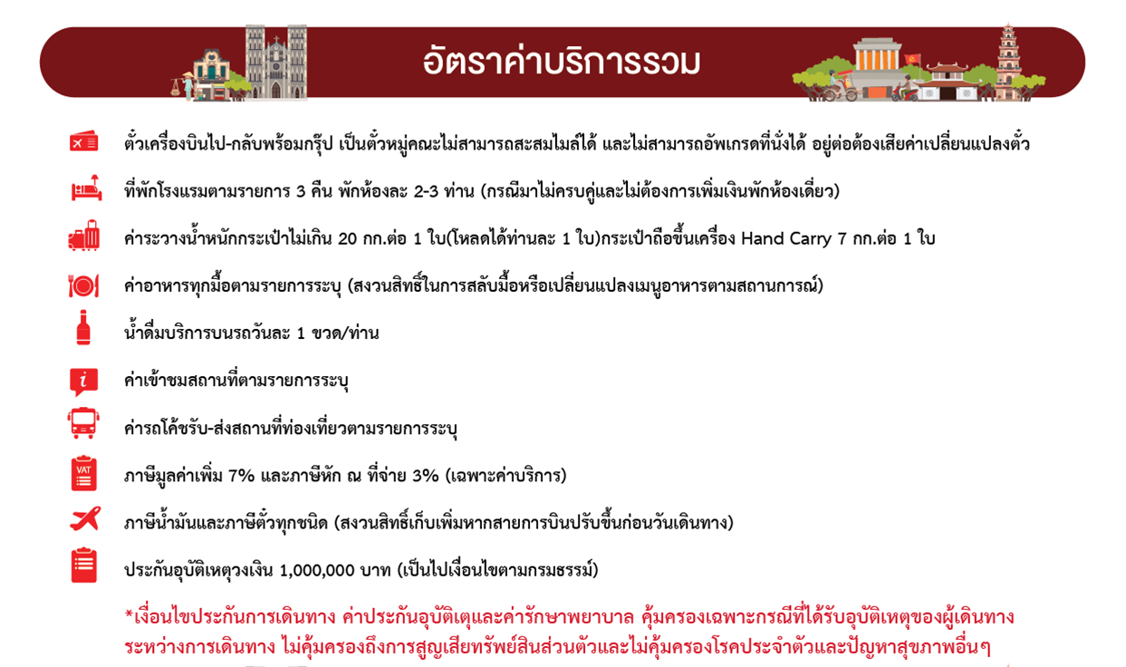 13.00 น. พร้อมกันที่ สนามบินสุวรรณภูมิ อาคารผู้โดยสาร ขาออก ชั้น 4 ประตู 3 เคาน์เตอร์ สายการบิน ไทยเวียตเจ็ท (VZ) โดยมีเจ้าหน้าที่อำนวยความสะดวกแก่ทุกท่าน
